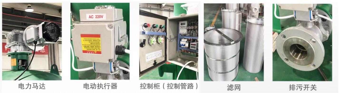 高温自清洗过滤器主要由不锈钢壳体、不锈钢滤网、不锈钢钢刷、控制柜、排污阀、控制器、密封圈等部件组成。