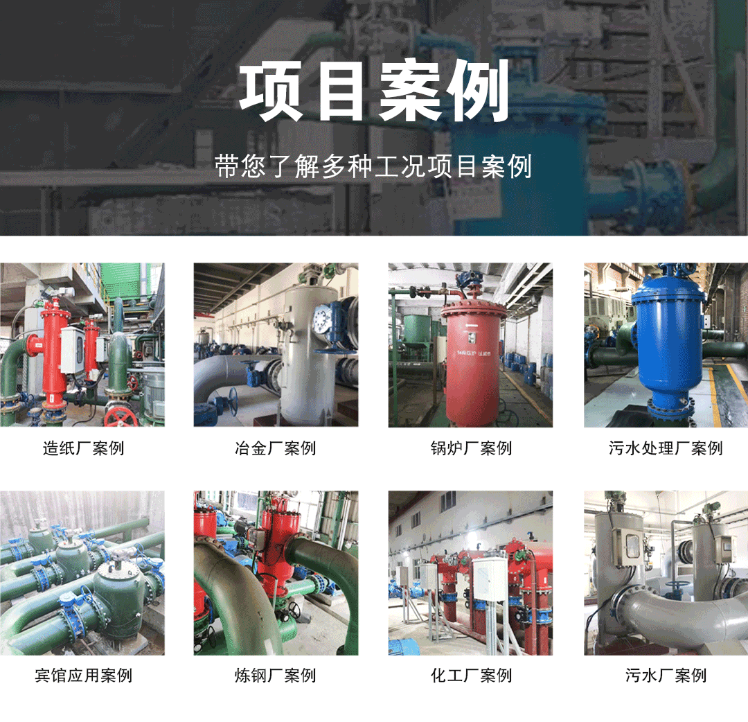 工业过滤应用:冷却水过滤;保护喷头;污水三级处理;市政水回用;车间用水;R.O.系统前过滤;酸洗;造纸白水过滤;注塑成型机;巴氏消毒系统;真空泵系统;空压机系统;连铸系统;水处理应用;制冷采暖水系统。